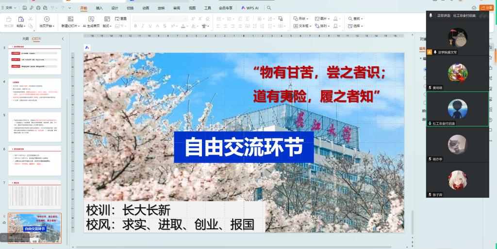 (通讯员 肖芳)9月8日,学院以“梦想启航·安全至上”为主题,召开2025级研究生新生线上主题班会,由辅导员盛文军主讲,为新生入学答疑解惑。会上,盛文军明确新生报到时间为9月13日下午-9月14日,地点在东校区文科大楼B区1110室,学校在荆州火车站、长途客运站设接站点,校园所有门均可进入。同时,他详细说明报到前需加入年级群改备注、用“今日校园”APP完成认证、备齐身份证等证件,提醒新生提前自行缴费,并就报到时的注意事项着重进行了强调。针对经济困难新生,学院将凭相关证明办理“绿色通道”。此外,对新生报到时的安全进行了详细的讲解,提醒新生注意安全。