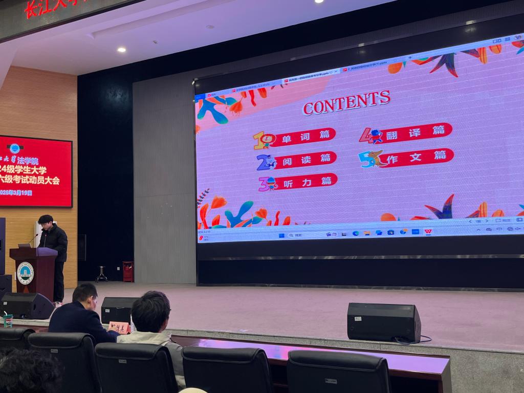 大会伊始,法学32404班的吴再渤与法学32402班的熊粤两位高分通过四级考试的学生代表先后登台,分享了他们学习英语的宝贵经验。吴再渤从单词、听力、阅读、翻译、作文五大方面进行了详细分析,并提出了“听力精听”和“阅读题型分类突破”的策略。熊粤则着重介绍了应试技巧,强调“视听一致、尊重原文、多背多用”,并通过现场演示讲解了具体的答题思路。两位同学的分享内容详实、实用性强,赢得了台下同学们的热烈掌声和赞扬。