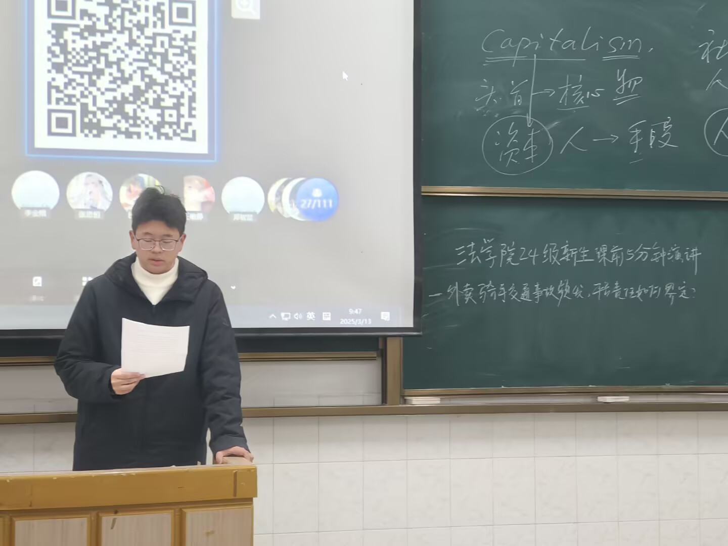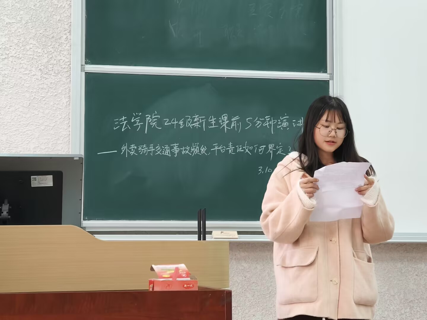 (通讯员李剑)3月10日至14日,新葡萄8883官网AMG在春季学期第四周开展了课前5分钟演讲活动,本次活动聚焦 “外卖骑手交通事故频发,平台责任如何界定?”这一热点话题,旨在引导新葡萄8883官网AMG学子运用专业知识,深入思考社会现实问题,提升法律分析能力。