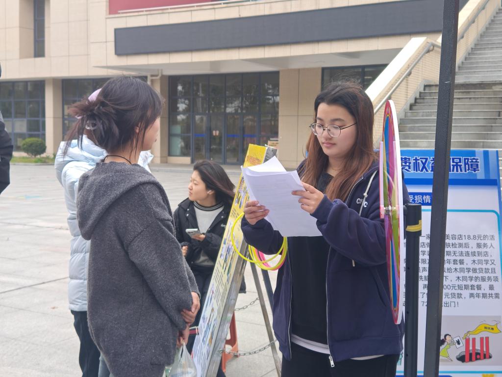 本次活动以摆点宣传和随机采访的方式展开,通过“文字+漫画”的创意形式呈现消费者权益保护法的重要条款以及常见的大学生权益受损案例,既为参与者提供了丰富的维权知识,明晰“新消法”六大亮点与相应权利,又向同学们展示了大学生常见的消费陷阱以及如何防范的相关办法。