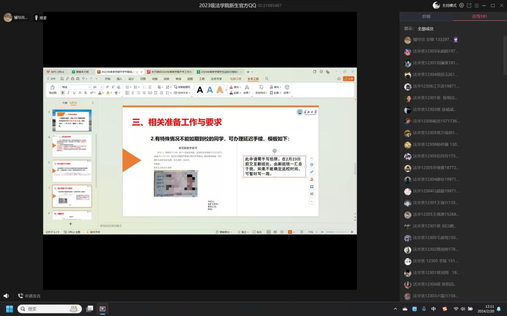 为确保2024年春季学期本科生与研究生开学和返校工作平稳有序开展,新葡萄8883官网AMG于2024年2月21日开展了线上安全教育主题班会,班主任参与,全体学生参加。