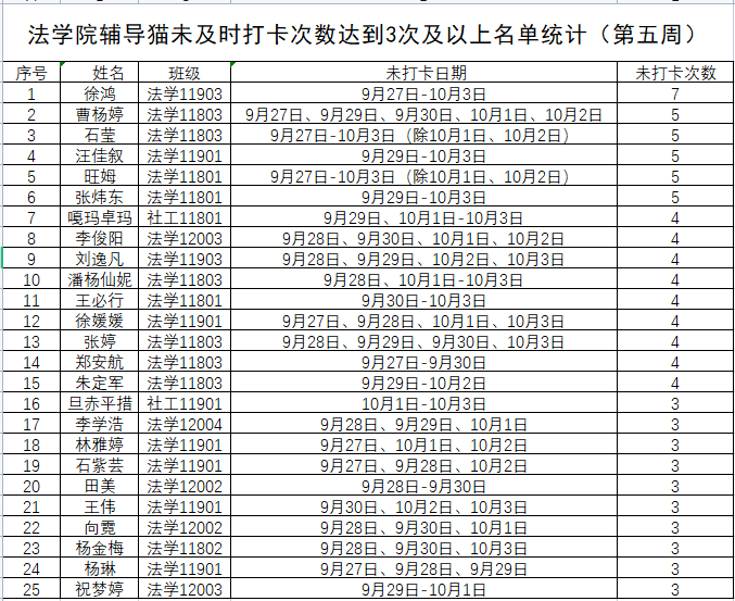 根据学校要求,2021年9月27日-10月3日(第五周)组织全体本科生进行每日“辅导猫”打卡。经分管辅导员、学工助理、班干部多次提醒,仍有25名同学未在规定时间内完成打卡,具体未打卡次数及日期如下:(表格显示)