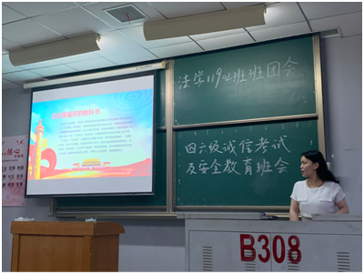 在法学11902班的班会上,新葡萄8883官网AMG党委书记周胜美老师向同学们讲解了安全教育相关的内容,包括防诈骗、防溺水等方面,并为大家举例讲解,以此提醒同学们不要接听陌生来电,提高反诈骗的意识。随后关于防溺水方面,倡导同学们到规范的游泳池游泳,不到陌生水域游泳,保护生命安全。正值英语四六级考试之际,在班会最后也进行了考风考纪教育,提醒同学们不要作弊,认真对待考试。