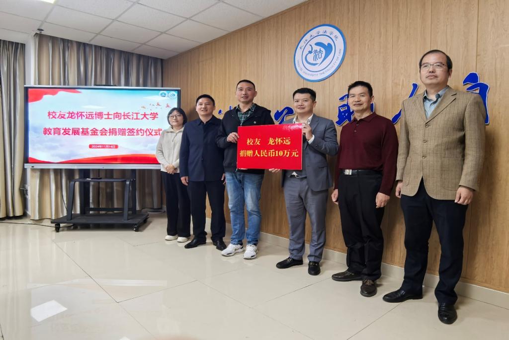 彭飞处长对龙怀远校友饮水思源、回馈母校的善举表示高度肯定。他指出,长大校友有责任、有担当,在各行各业成就斐然,母校深感欣慰并引以为荣,学校是校友永远的家。他强调,龙怀远校友奋斗经历值得学习,此次捐赠为在校生上了一堂生动鲜活的思政大课。希望广大校友家庭幸福、事业顺利,能够常回母校看看,进一步加强交流合作,共同促进母校、校友事业发展。