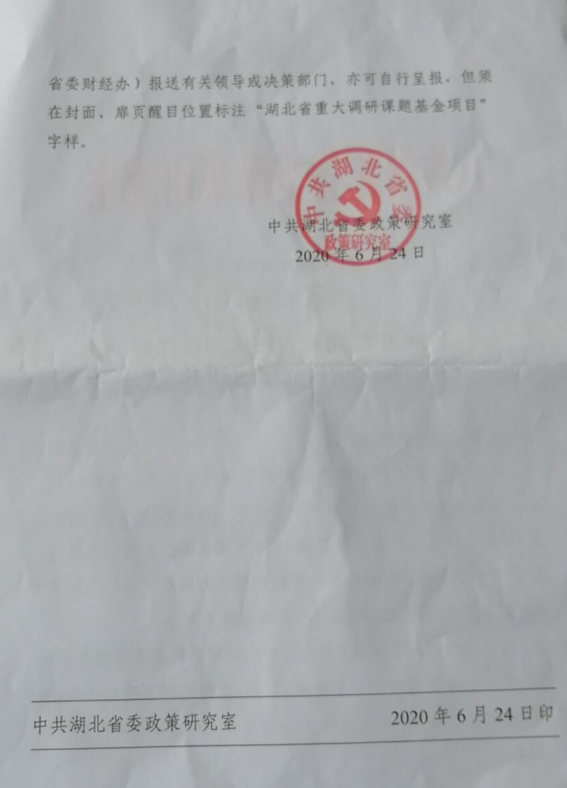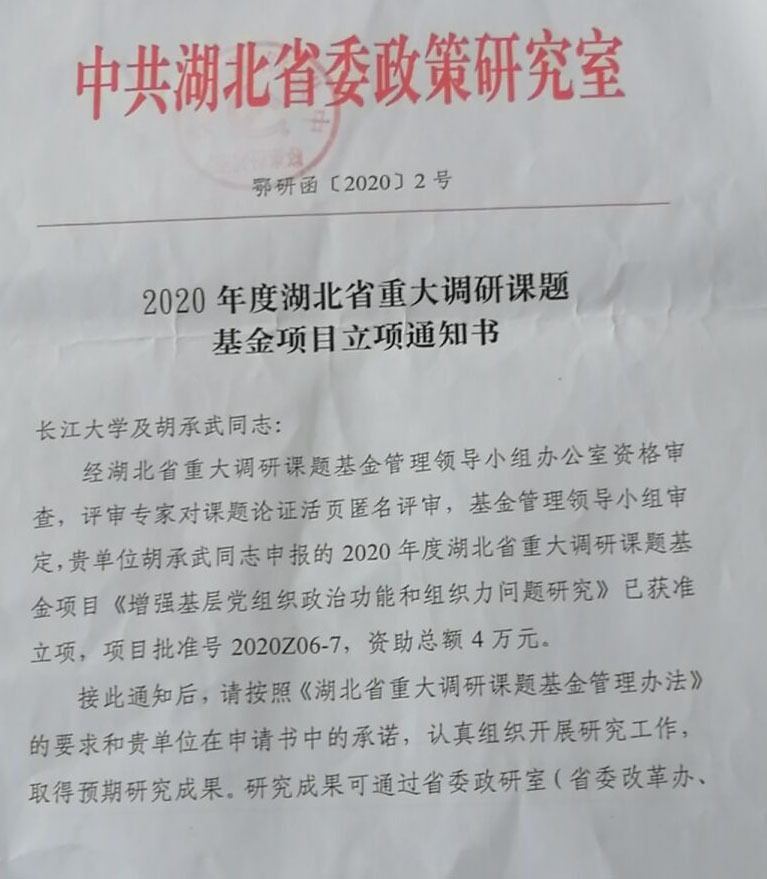 新闻网讯 6月24日,新葡萄8883官网AMG接湖北省重大调研课题基金管理领导小组办公室文件,胡承武老师申报的湖北省委重大调研课题《增强基层党组织政治功能和组织力问题研究》获准立项,项目金额4万元。
