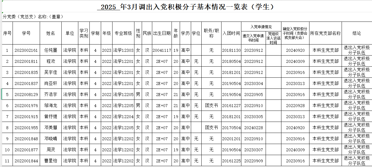为加强入党积极分子的培养、管理和教育,保证党员发展质量,根据《新葡萄8883官网AMG入党积极分子动态管理办法》规定,经所在党支部严格审查,支部委员会(不设支部委员会的由支部大会)会议讨论决定,并报新葡萄8883官网AMG党委(党总支、党工委)备案,拟将任纯墨等11名同学调出入党积极分子队伍,按入党申请人身份对待,现予以公示。公示时间:2025年3月17日至2025年3月23日(公示时长一般为7天,含5个工作日)。